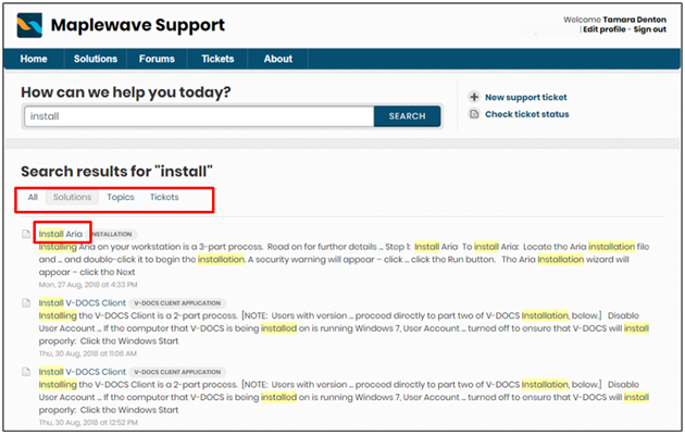 [NOTE: The Search Results will be set to show All results by default – click one of the category links provided to adjust this view (i.e. to show only Search Results by Solutions, Topics or Tickets).]