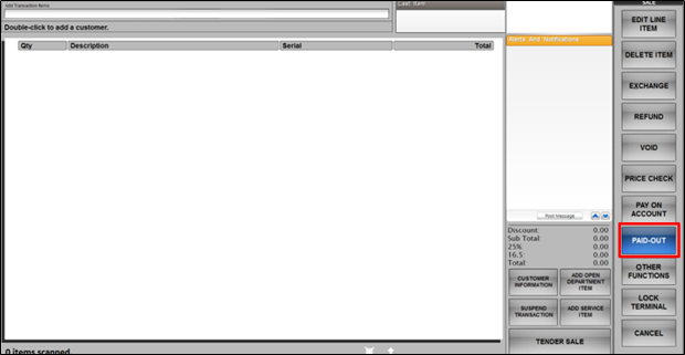 - Select the Paid-Out button from the menu on the right-hand side of the Transaction screen.