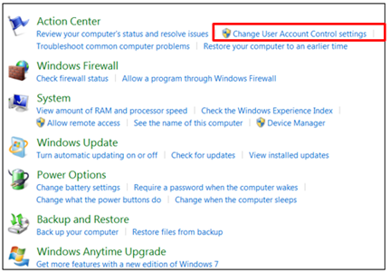 3. Beneath the Action Center heading, select Change User Account Control Settings.